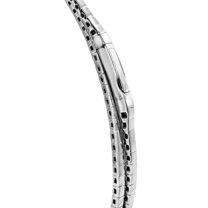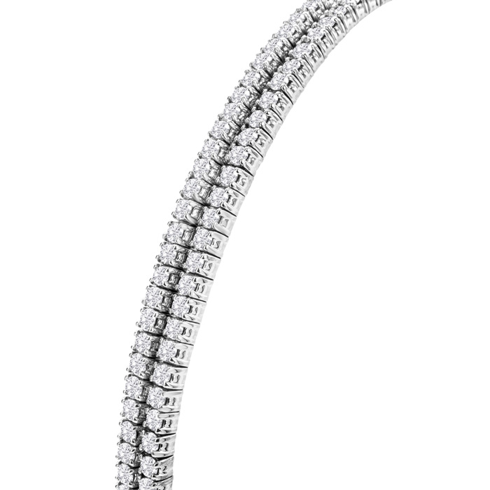 This amazing diamond tennis bangle bracelet features 96 sparkling diamonds in a double row. This bracelet is in 14 karat white gold and is 7 inches long with a box with tongue and safety clasp. Each strand is 2mm wide. This bangle bracelet is extremely flexible.