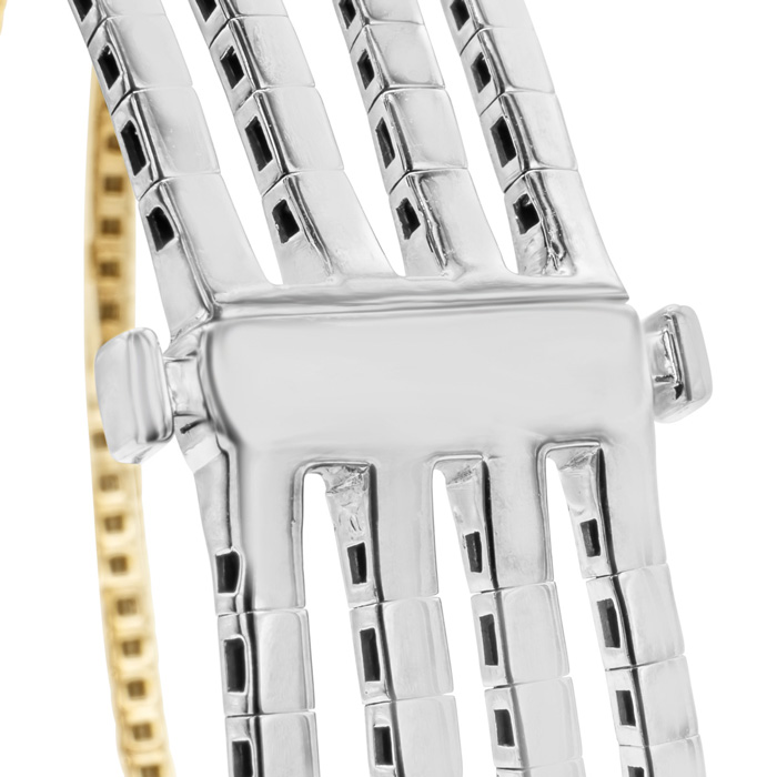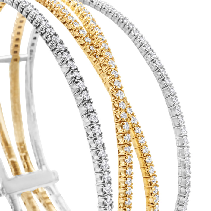 This amazing diamond tennis bangle bracelet features 216 sparkling diamonds across 4 rows. This bracelet is in 14 karat two tone gold and is 7 inches long with a box with tongue and safety clasp. Each strand is 2mm wide. This bangle bracelet is extremely flexible.