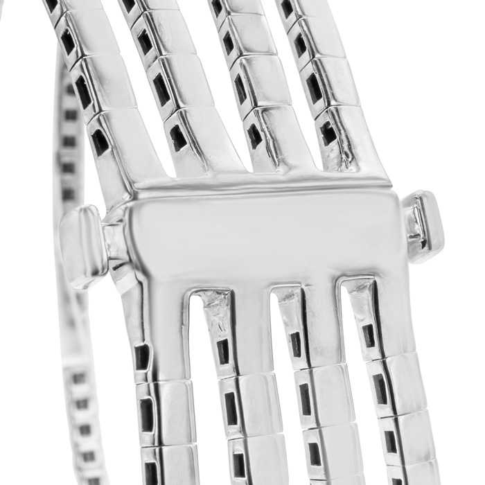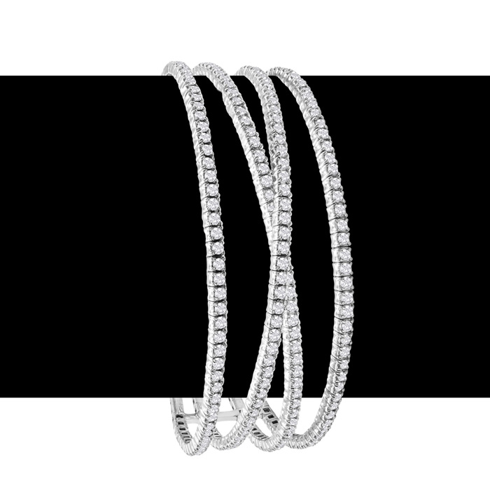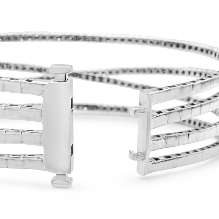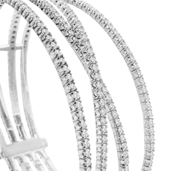 This amazing diamond tennis bangle bracelet features 216 sparkling diamonds across 4 rows. This bracelet is in 14 karat white gold and is 7 inches long with a box with tongue and safety clasp. Each strand is 2mm wide. This bangle bracelet is extremely flexible.