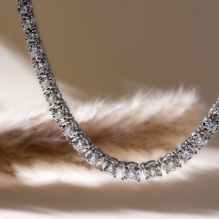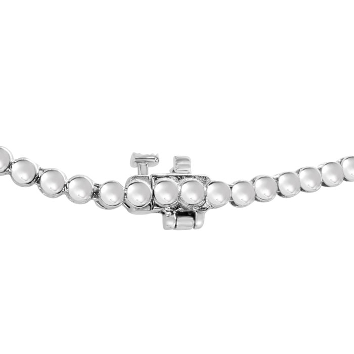 This classic graduated diamond tennis necklace in 14 karat white gold features 61 sparkling diamonds in I-J color, I1-I2 clarity. Total carat weight is 5 carats. This necklace is 18 inches long and has a secure box with tongue and safety clasp.
