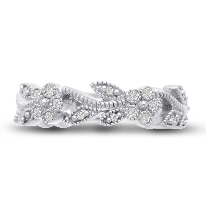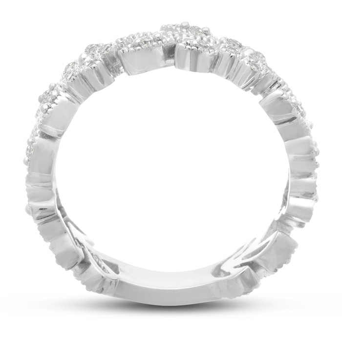 This floral ring is a nice feminine twist on your typical wedding band, I absouletly love it! There are 35 diamonds in this piece, but the textured white gold makes it look like there are many more, and also gives it a nice vintage inspired look. I think this would be great to spice up any solitaire engagement ring, or even to wear just as an everyday accesory.