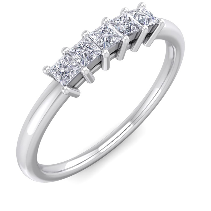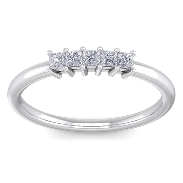 This unbelievable diamond wedding band ring features 5 princess shape diamonds totaling 1/4 carat. Diamond color is G-H, diamond clarity is SI1-SI2. This ring is in 14 karat white gold.