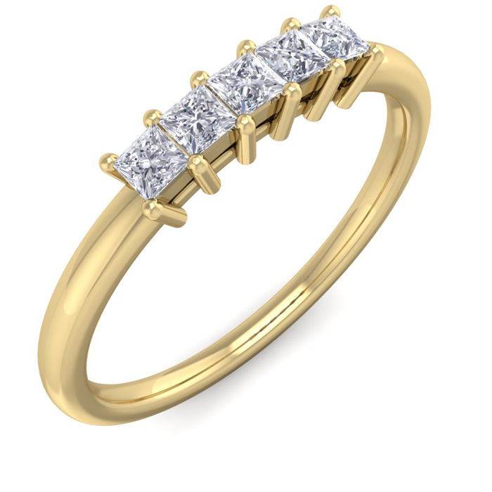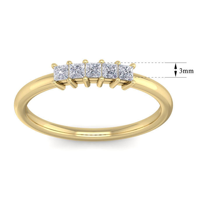 This unbelievable diamond wedding band ring features 5 princess shape diamonds totaling 1/4 carat. Diamond color is G-H, diamond clarity is SI1-SI2. This ring is in 14 karat yellow gold.