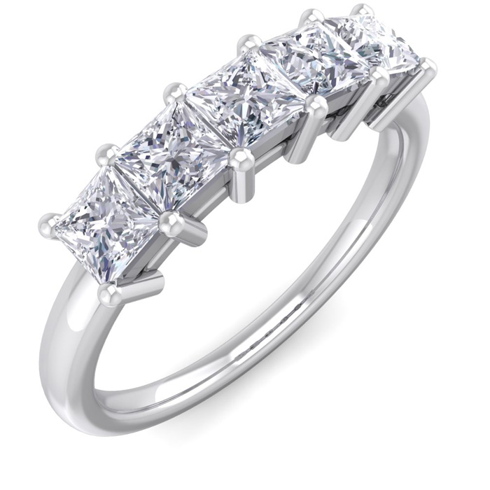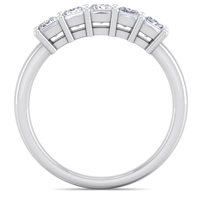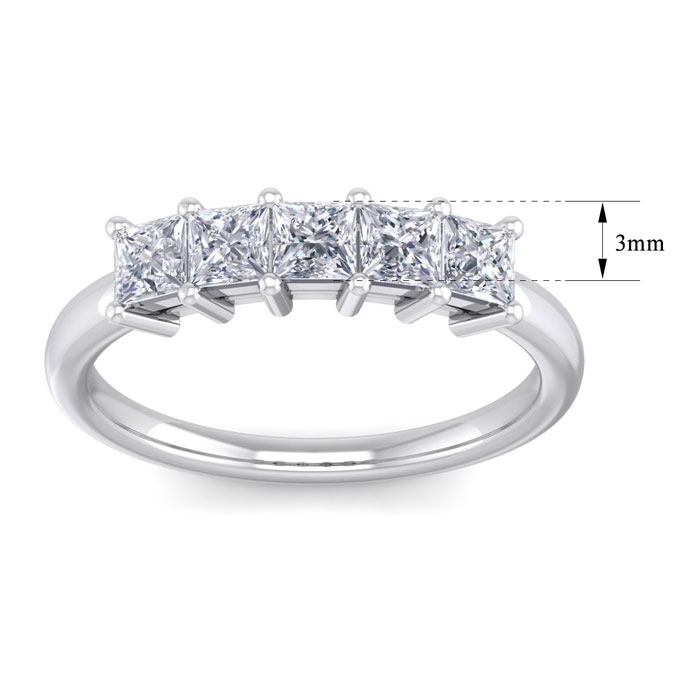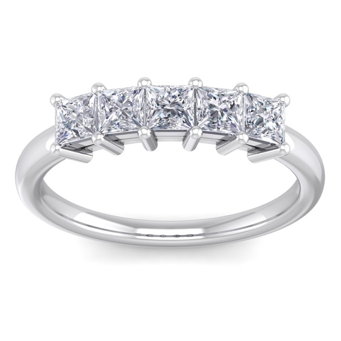 This unbelievable diamond wedding band ring features 5 princess shape diamonds totaling 1 carat. Diamond color is G-H, diamond clarity is SI1-SI2. This ring is in 14 karat white gold.
