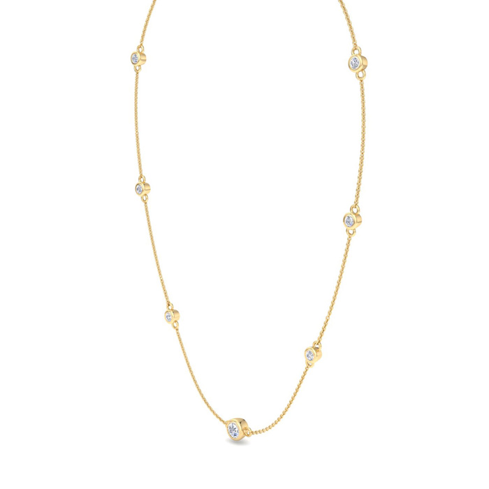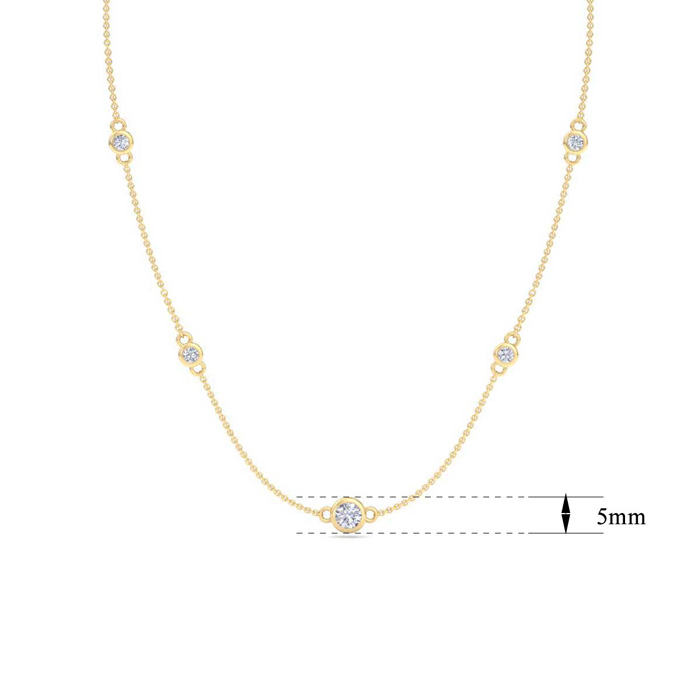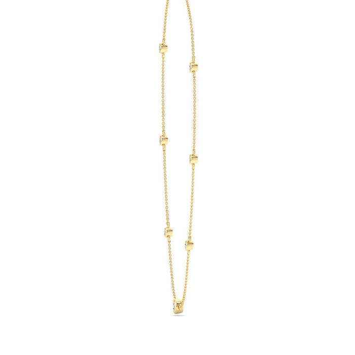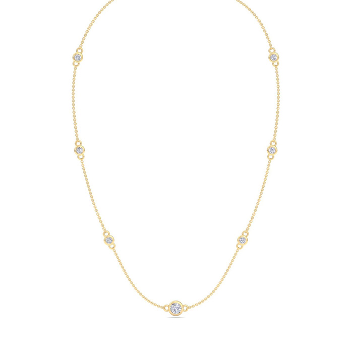 This diamonds by the yard necklace features a 1/2 carat round shape center lab grown diamond and six 1/10 carat lab grown diamonds in G-H color, VS clarity. Total carat weight is 1 carat. This necklace is in 14 karat yellow gold and comes with an 18 inch cable chain with a lobster-claw clasp.