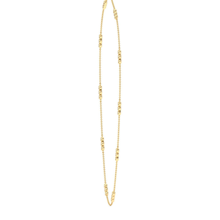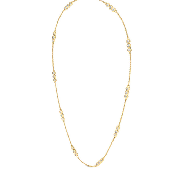 This diamonds by the yard necklace features 30 round shape lab grown diamonds in clusters of 3 in G-H color, VS clarity. Total carat weight is 1 carat. This necklace is in 14 karat yellow gold and comes with an 18 inch cable chain with a lobster-claw clasp.