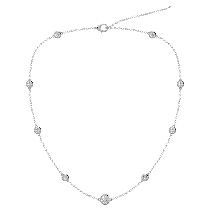 This stunning diamonds by the yard necklace features 9 bezel set diamonds. It contains 8 diamonds weighing approximately 1/4 carat each and 1 clarity enhanced diamond weighing approximately 3/4 carat. Total carat weight is 2 3/4 carats. Diamond color is I-J, diamond clarity is I2. Necklace is in 14 karat white gold and is 16 inches long with a two inch extender and has a lobster-claw clasp on a cable chain.