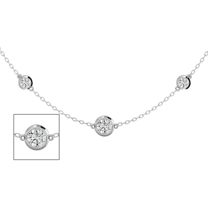 This stunning diamonds by the yard necklace features 9 bezel set diamonds. It contains 8 diamonds weighing approximately 1/4 carat each and 1 clarity enhanced diamond weighing approximately 3/4 carat. Total carat weight is 2 3/4 carats. Diamond color is I-J, diamond clarity is I2. Necklace is in 14 karat white gold and is 16 inches long with a two inch extender and has a lobster-claw clasp on a cable chain.