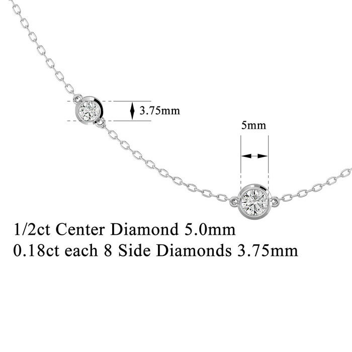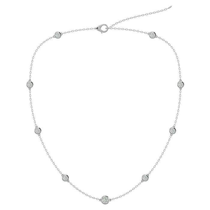 This stunning diamonds by the yard necklace features 9 bezel set diamonds. It contains 8 diamonds weighing approximately 1/5 carat each and 1 diamond weighing approximately 1/2 carat. Total carat weight is 2 carats. Diamond color is H-I, diamond clarity is SI2-I1. Necklace is in 14 karat white gold and is 16 inches long with a two inch extender and has a lobster-claw clasp on a cable chain.