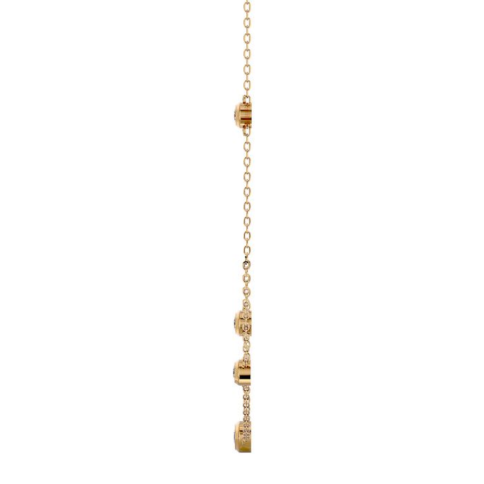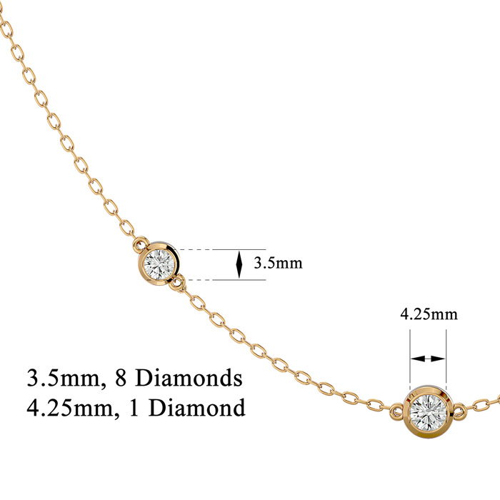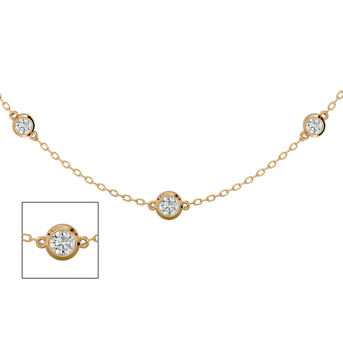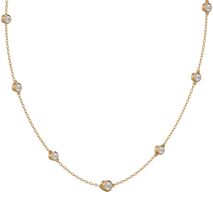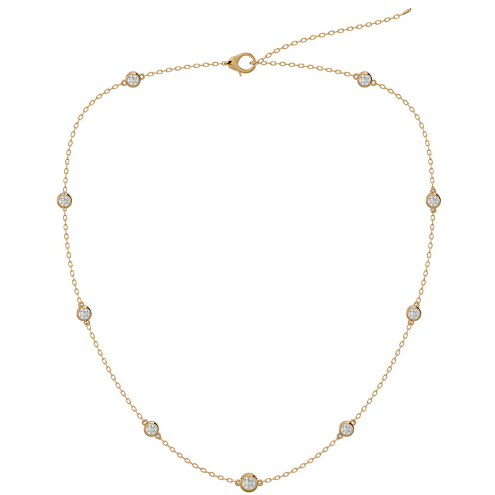 This stunning diamonds by the yard necklace features 9 bezel set diamonds. It contains 8 diamonds weighing approximately 0.15 carats each and 1 diamond weighing approximately 1/4 carat. Total carat weight is 1 1/2 carats. Diamond color is I-J, diamond clarity is I2. Necklace is in 14 karat yellow gold and is 16 inches long with a two inch extender and has a lobster-claw clasp on a cable chain.