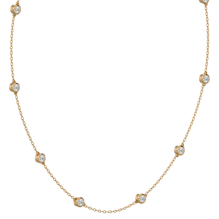 Now, let’s talk about this special diamonds by the yard necklace we've got. It has ten shiny diamonds on it. Each diamond is about 1/5 of the total weight, so if you add them all up, they weigh 2 carats. That's a lot of sparkle!