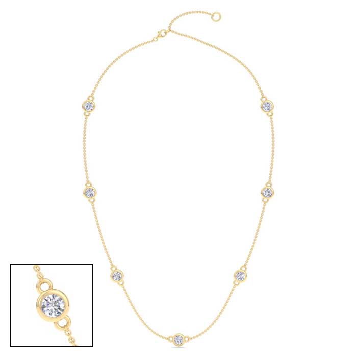 This diamonds by the yard necklace features seven 1/3 carat lab grown diamonds in G-H color, VS clarity. Total carat weight is 2 1/3 carats. This necklace is in 14 karat yellow gold and comes with an 18 inch cable chain with a lobster-claw clasp.