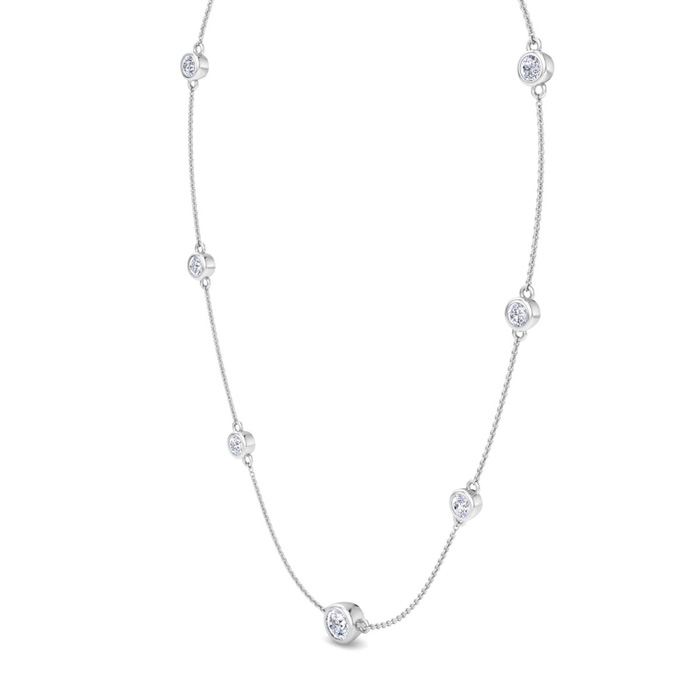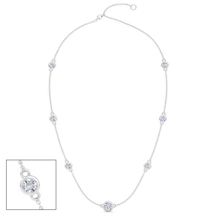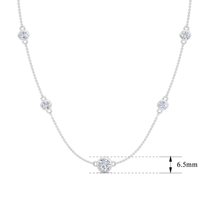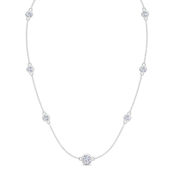 This diamonds by the yard necklace features a 1 carat round shape center lab grown diamond and six 1/3 carat lab grown diamonds in G-H color, VS clarity. Total carat weight is 3 carats. This necklace is in 14 karat white gold and comes with an 18 inch cable chain with a lobster-claw clasp.