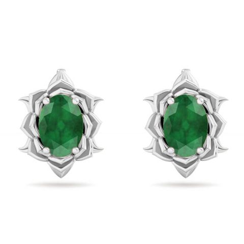 1 1/2 Carat Oval Shape Emerald Ornate Stud Earrings In 14K White Gold