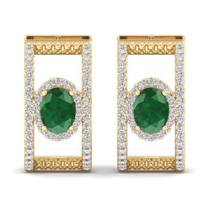 These emerald earrings feature two 7x5mm oval shape emerald gemstones totaling approximately 1 1/2 carats. They are accented with 106 lab grown diamonds weighing 1 carat. Total carat weight is 2 1/2 carats. Diamond color is G-H color, VS clarity. These earrings are in 14 karat yellow gold and dangle down 3/4 inch.