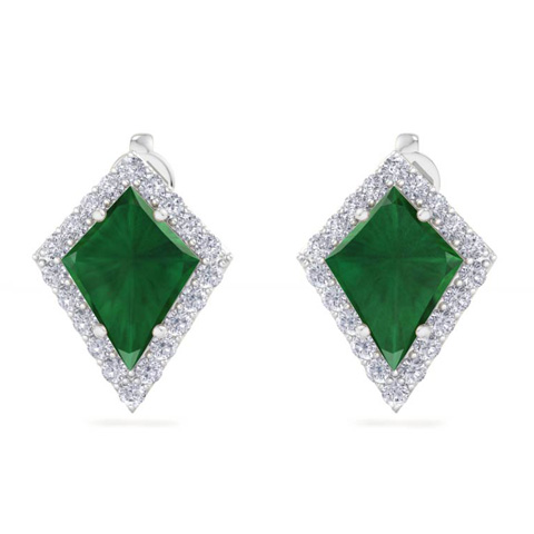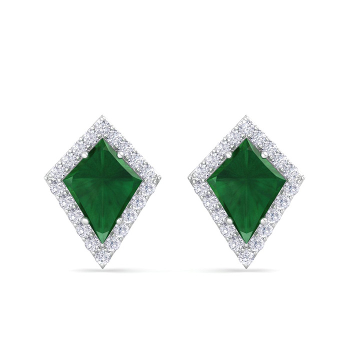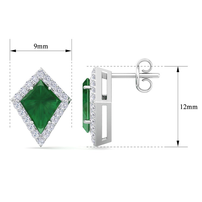 These gemstone earrings feature two 8x6mm kite shape created emerald gemstones each weighing approximately 1 carat. There are 40 sparkling diamonds in I-J color, I1-I2 clarity totaling approximately 1/5 carat. Total carat weight is 2 1/5 carats. These earrings are in 14 karat white gold.