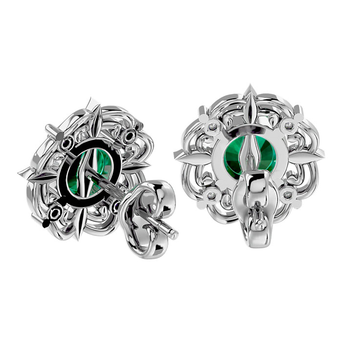 These stunning emerald earrings features two round shape 6x6mm created emerald gemstones each weighing approximately 1 carat. It is surrounded by 8 sparkling diamonds in I-J color, I1-I2 clarity at 1/10 carat. Total carat weight is 2.10 carats. These earrings are crafted in sterling silver and have comfortable and secure post with friction backs.