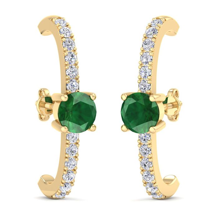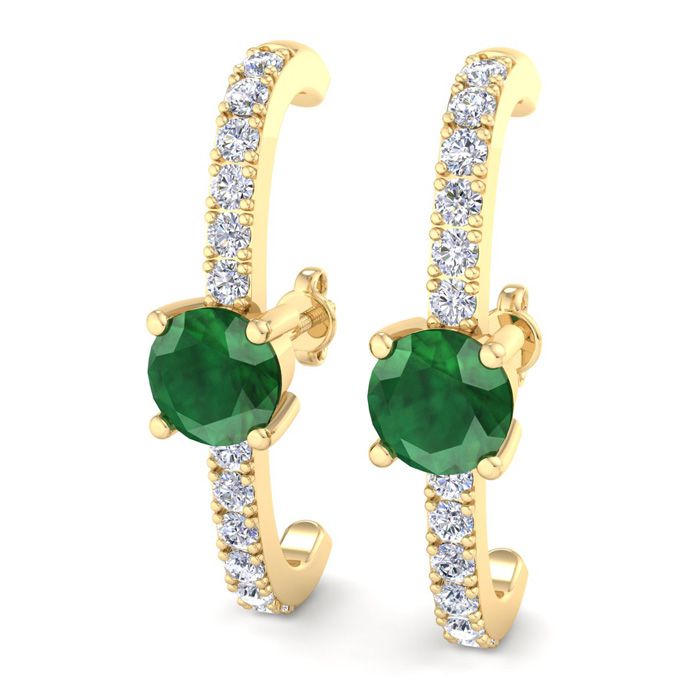 2 Carat Emerald and Lab Grown Diamond Hoop Earrings In 14 Karat Yellow Gold, 1 Inch - Round