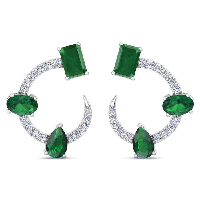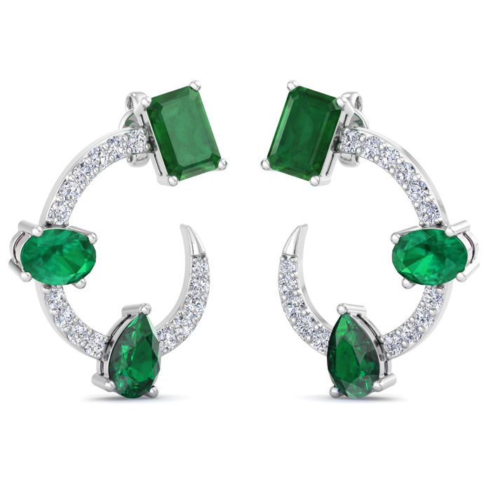 These lab grown diamond earrings feature 6 emerald gemstones and 30 round shape lab grown diamonds in G-H color, VS clarity. Total carat weight is 3 carats. These earrings are in 14 karat white gold. These earrings dangle down 3/4 Inch and have post with friction backs.
