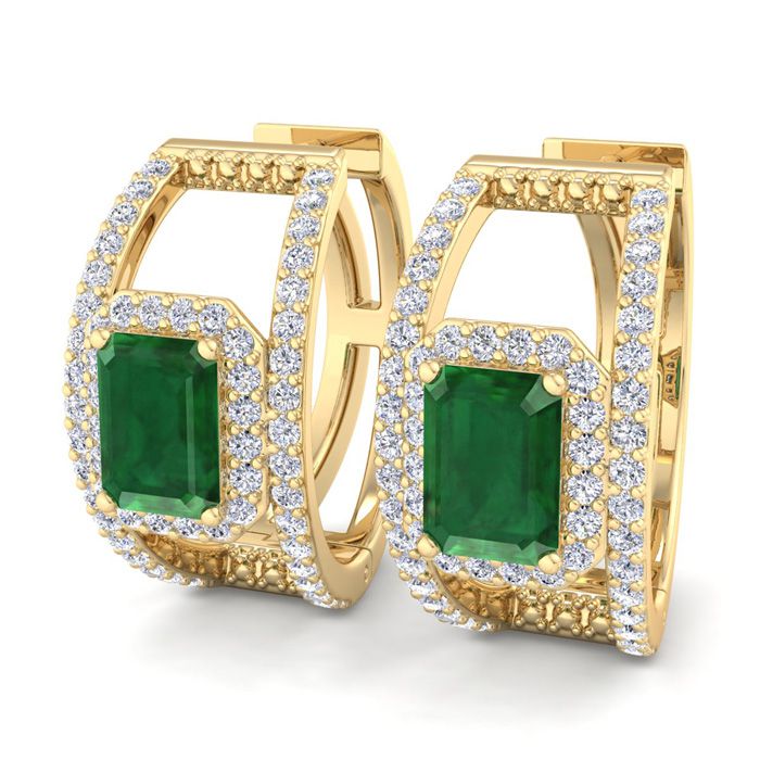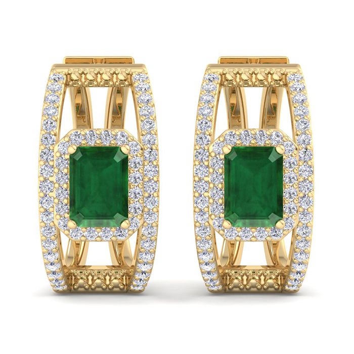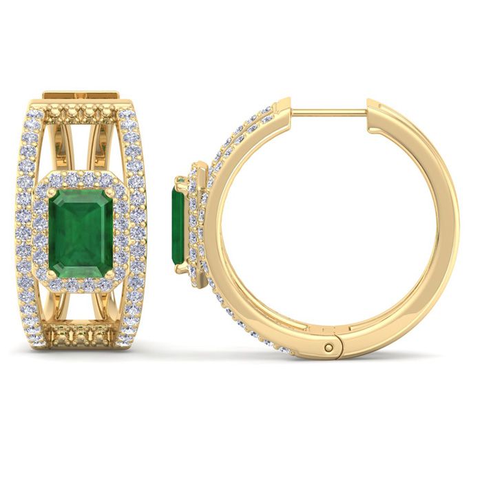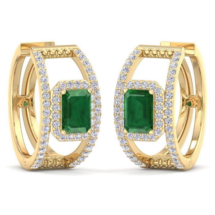 3 Carat Emerald and Lab Grown Diamond Hoop Earrings In 14 Karat Yellow Gold