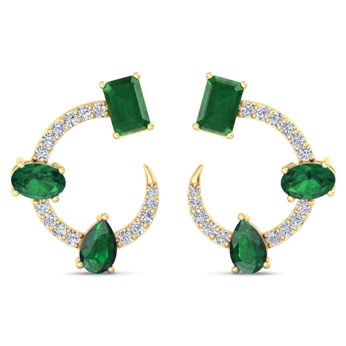 These lab grown diamond earrings feature 6 emerald gemstones and 30 round shape lab grown diamonds in G-H color, VS clarity. Total carat weight is 3 carats. These earrings are in 14 karat yellow gold. These earrings dangle down 3/4 Inch and have post with friction backs.