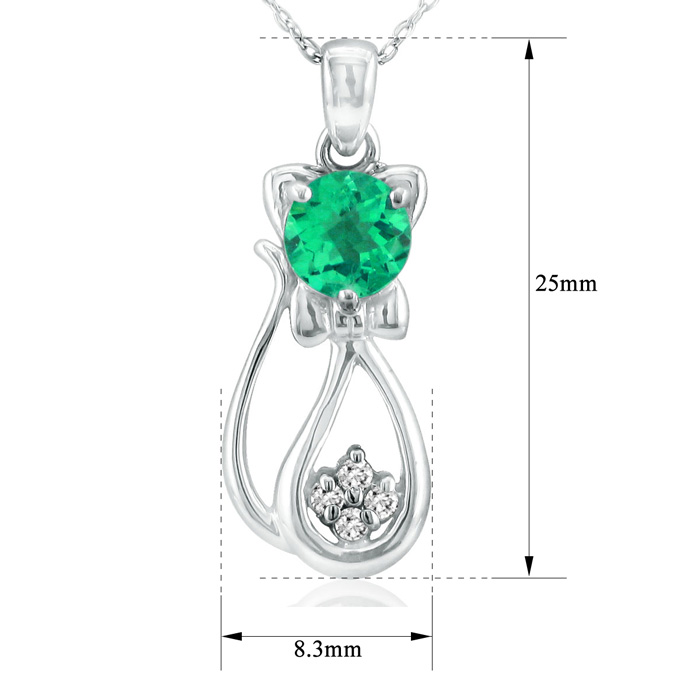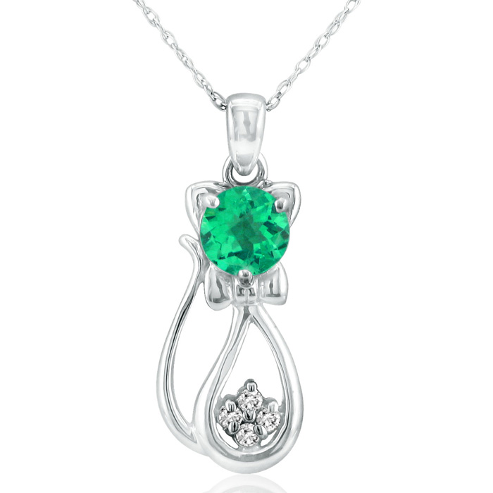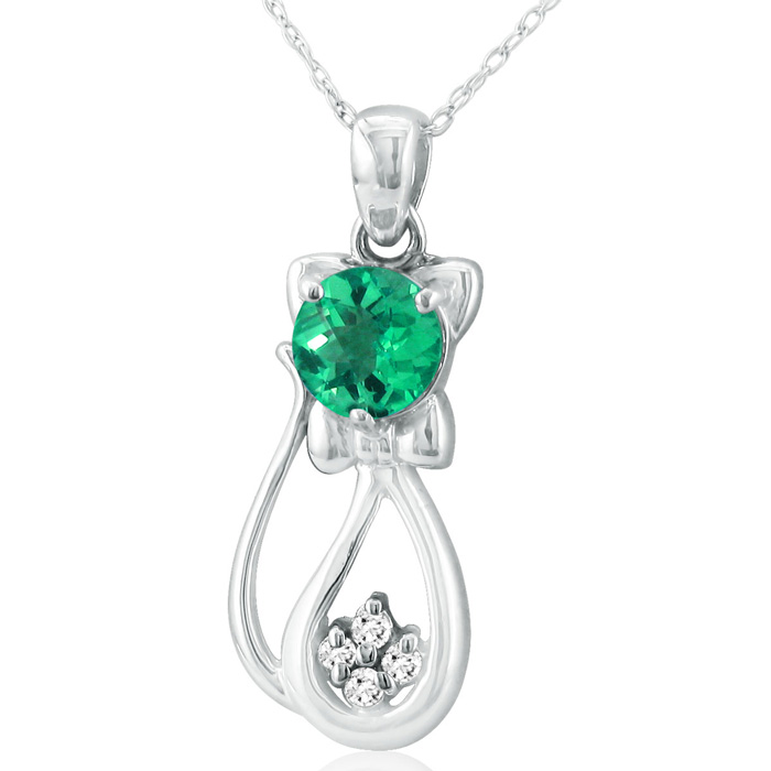 This emerald necklace features a 1 carat round created emerald gemstone in an adorable cat pendant. There are 4 sparkling diamonds in J-K color, I1-I2 clarity at 0.06 carats. Total carat weight is 1.06 carats. This necklace is in 10 karat white gold and comes with an 18 inch cable chain with a spring-ring clasp.