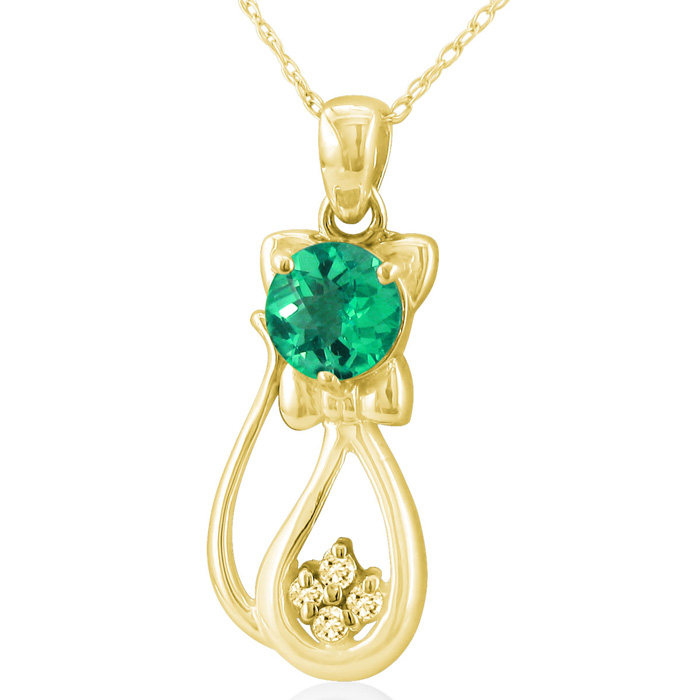 This emerald necklace features a 1 carat round created emerald gemstone in an adorable cat pendant. There are 4 sparkling diamonds in J-K color, I1-I2 clarity at 0.06 carats. Total carat weight is 1.06 carats. This necklace is in 10 karat yellow gold and comes with an 18 inch cable chain with a spring-ring clasp.