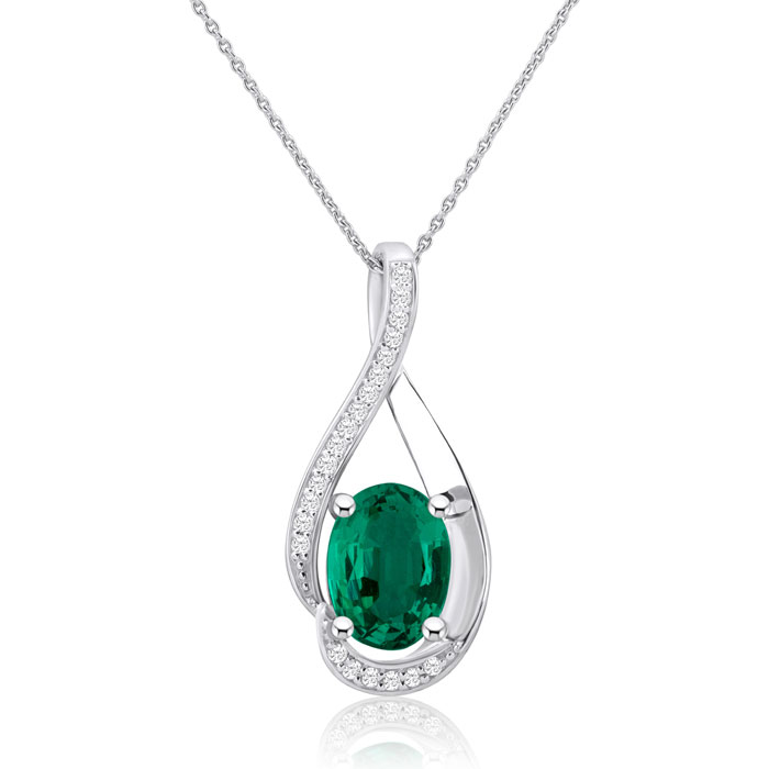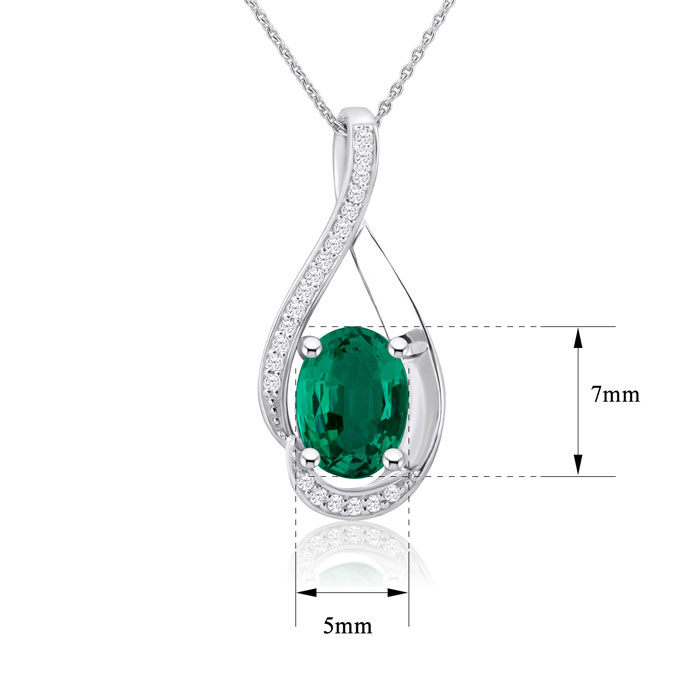 This stunning emerald necklace features one 6x4mm oval shape Emerald gemstone weighing approximately 3/4 carat. It is surrounded by 18 sparkling diamonds in H-I color, I2-I3 clarity at 0.08 carats. This necklace is crafted in sterling silver and comes with an 18 inch box chain with spring ring clasp.