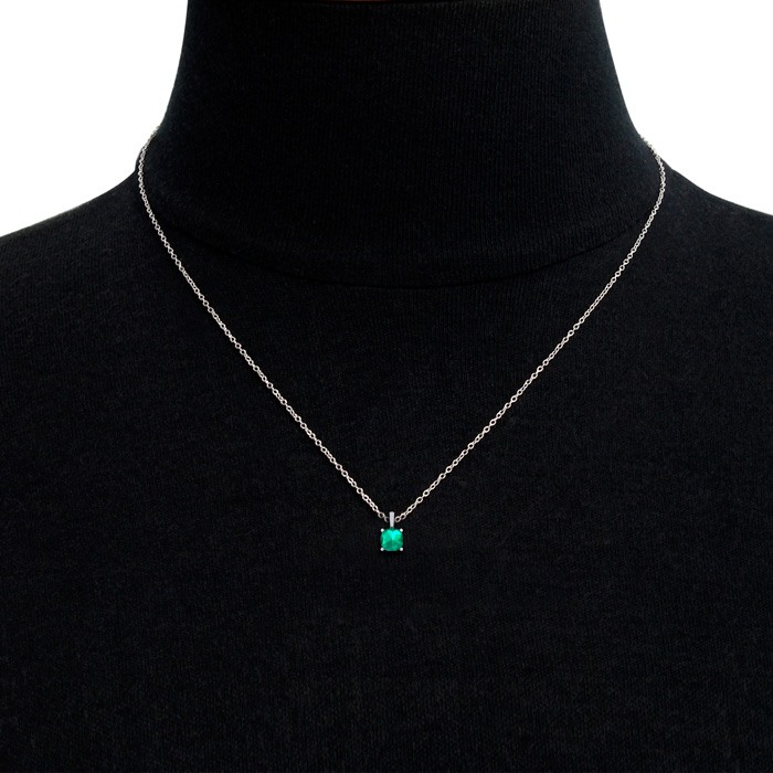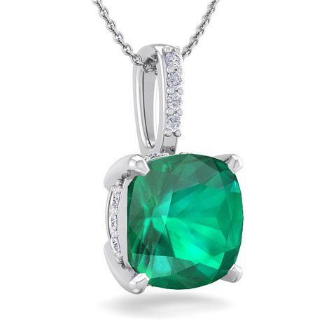 This emerald necklaces features one 6mm cushion shape created emerald gemstone at approximately 1-1/10 carat. It is accented with 15 sparkling diamonds in I-J color, I1-I2 clarity at approximately 1/25 carats total. Total gem weight is approximately 1-1/10 carats. This necklace is in 14 karat white gold. This necklace comes with an 18 inch chain with a spring-ring clasp.