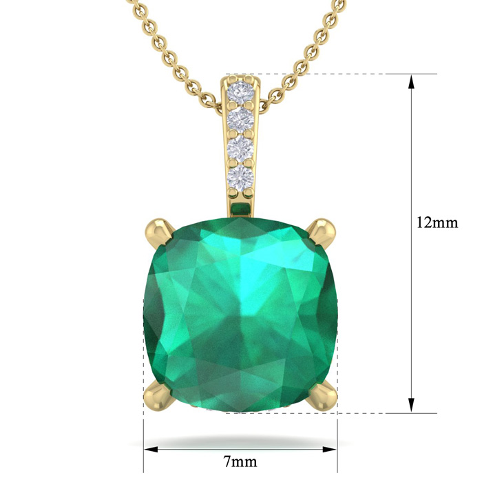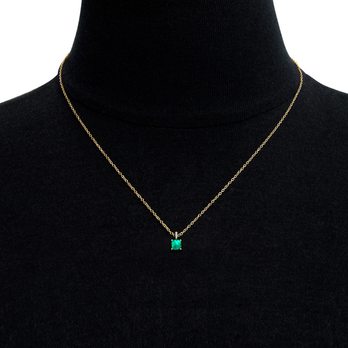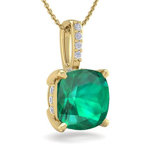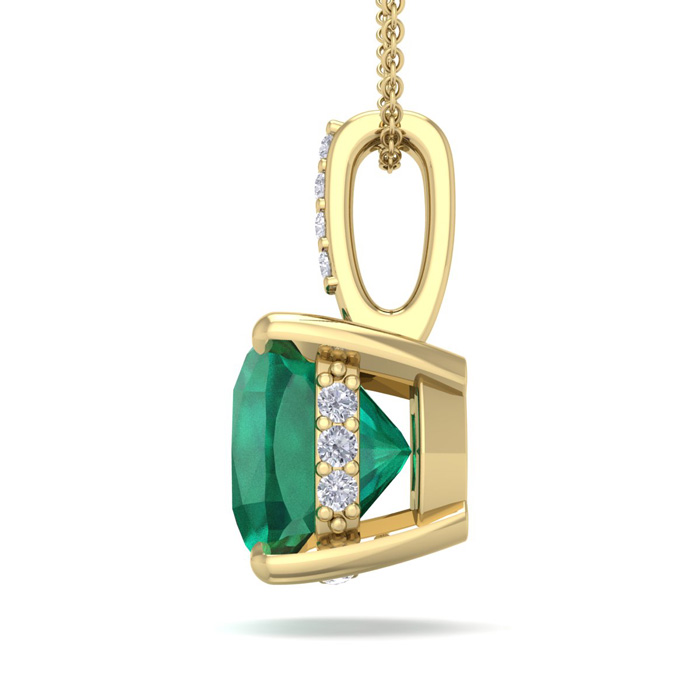 This emerald necklaces features one 6mm cushion shape created emerald gemstone at approximately 1-1/10 carat. It is accented with 15 sparkling diamonds in I-J color, I1-I2 clarity at approximately 1/25 carats total. Total gem weight is approximately 1-1/10 carats. This necklace is in 14 karat yellow gold. This necklace comes with an 18 inch chain with a spring-ring clasp.