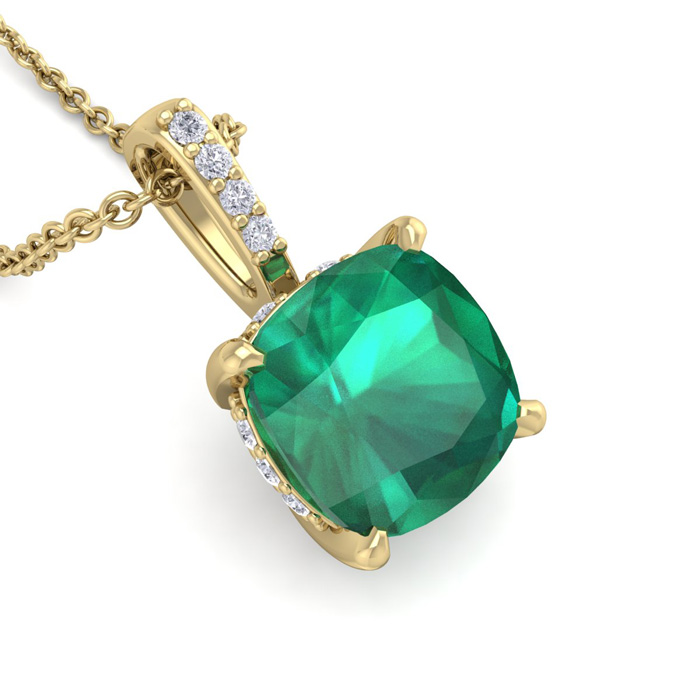 1-1/10 Carat Cushion Shape Emerald Necklaces With Hidden Diamond Halo In 14 Karat Yellow Gold, 18 Inch Chain