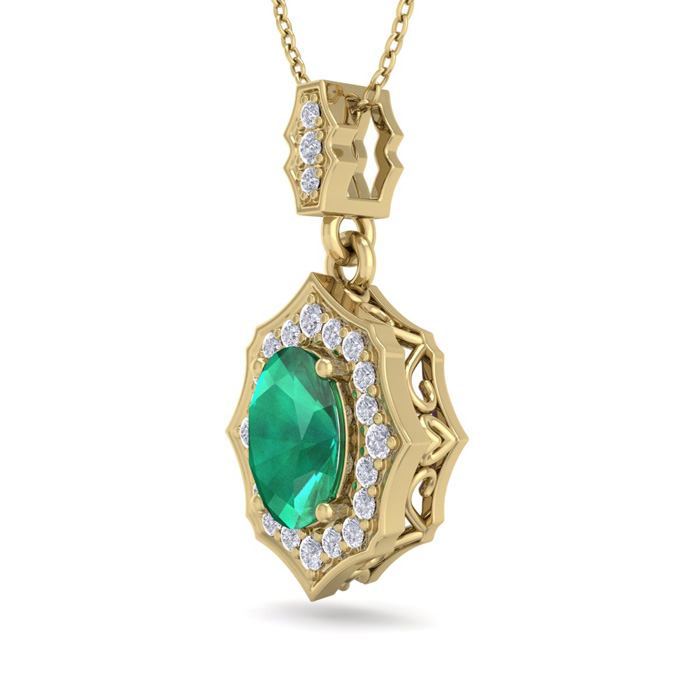1-1/2 Carat Oval Shape Emerald Necklaces With Diamonds In 14 Karat Yellow Gold, 18 Inch Chain
