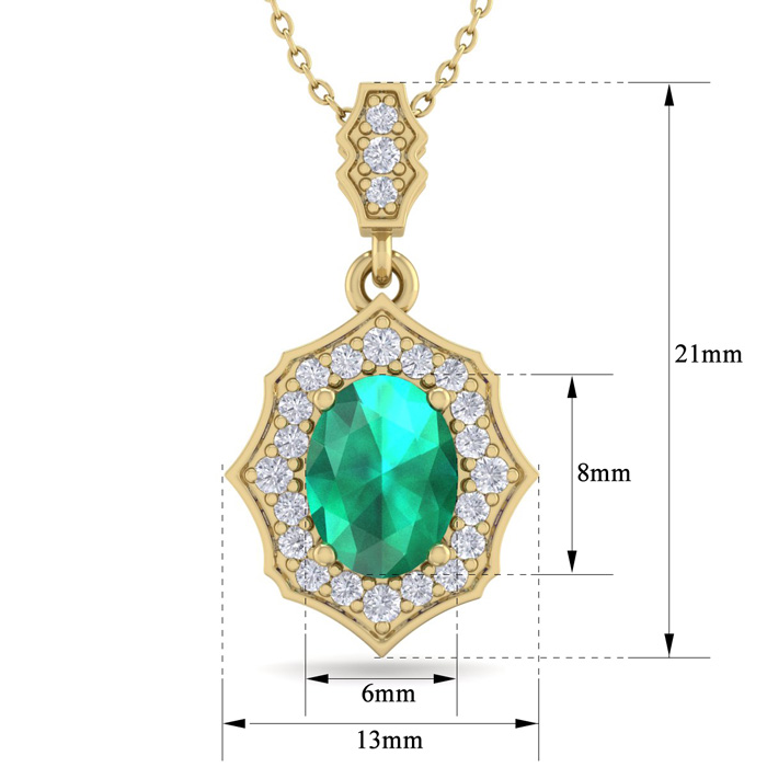 This emerald necklaces features one 8x6mm oval shape emerald gemstone at approximately 1-1/7 carats. It is surrounded by 23 sparkling diamonds in I-J color, I1-I2 clarity at approximately 1/4 carat total weight. Total gem weight is approximately 1-1/2 carat total weight. This necklace is in 14 karat yellow gold and comes with an 18 inch chain with a spring ring clasp.