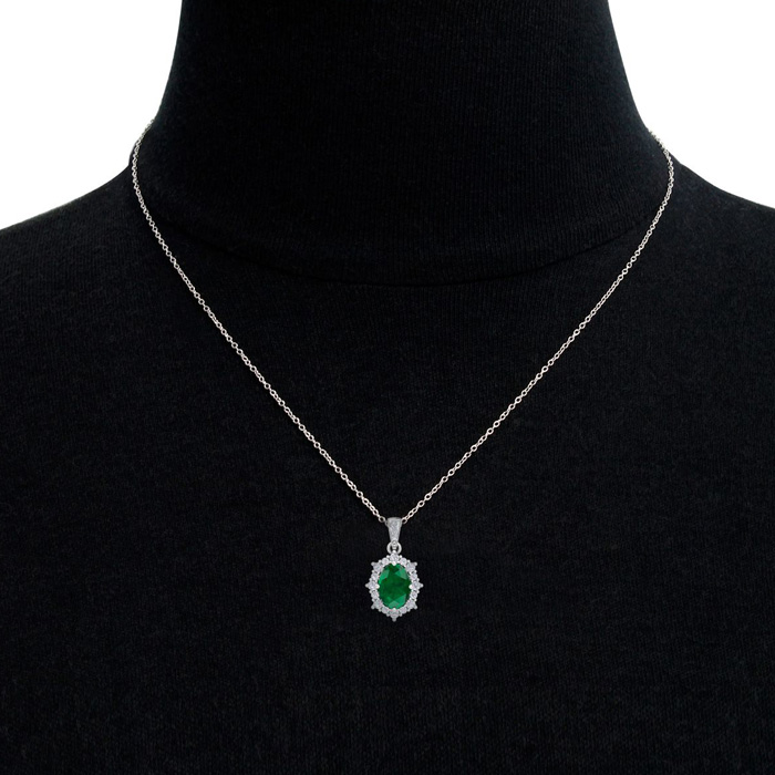 1-1/3 Carat Oval Shape Emerald Necklaces With Diamond Halo In 14 Karat White Gold, 18 Inch Chain
