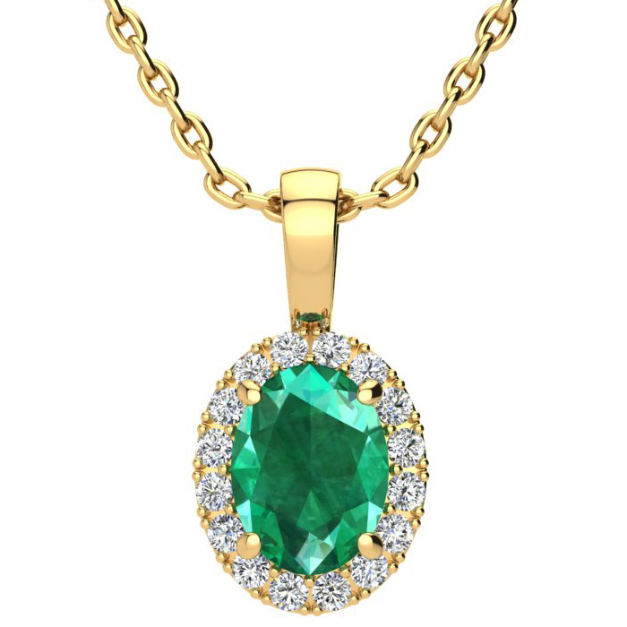 This emerald necklaces features one 8x6mm oval shape emerald gemstone at approximately 1-1/6 carats. It is surrounded by 20 sparkling diamonds in I-J color, I1-I2 clarity at approximately 1/6 carats. Total gem weight is approximately 1-1/3 carats. This necklace is crafted in 14 karat yellow gold and comes with an 18 inch chain with spring ring clasp.