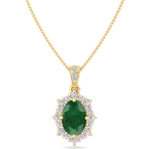 1-1/3 Carat Oval Shape Emerald Necklaces With Diamond Halo In 14 Karat Yellow Gold, 18 Inch Chain