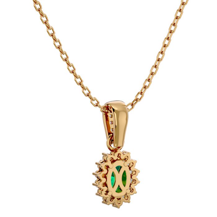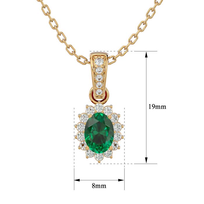 1 Carat Oval Shape Emerald Necklaces With Diamond Halo In 14 Karat Yellow Gold, 18 Inch Chain
