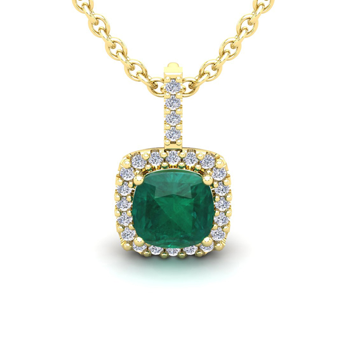 2-1/2 Carat Cushion Shape Emerald Necklaces With Diamond Halo In 14 Karat Yellow Gold, 18 Inch Chain
