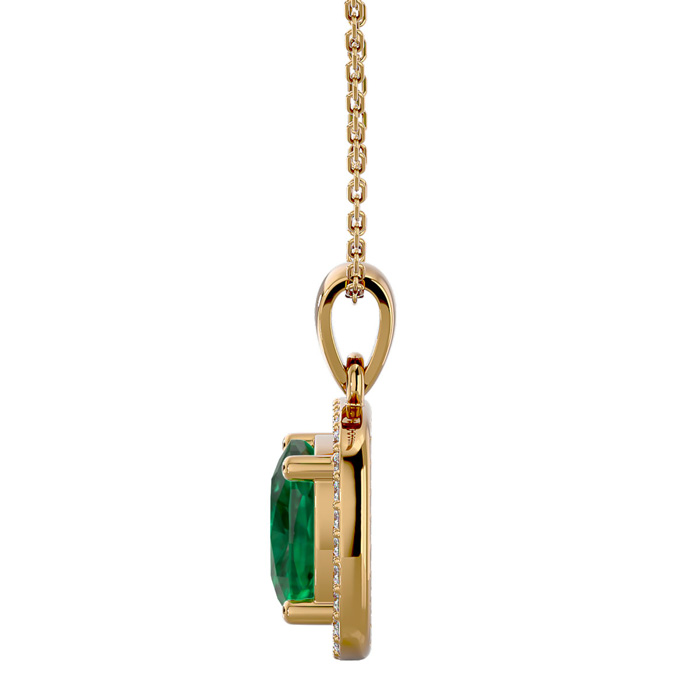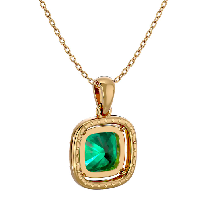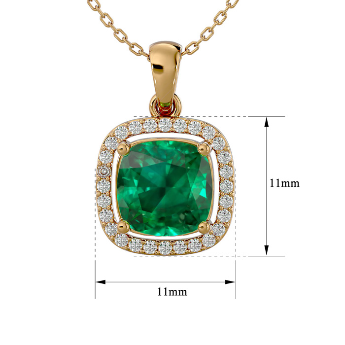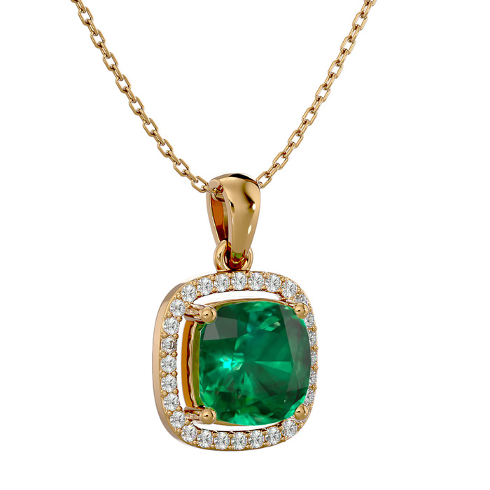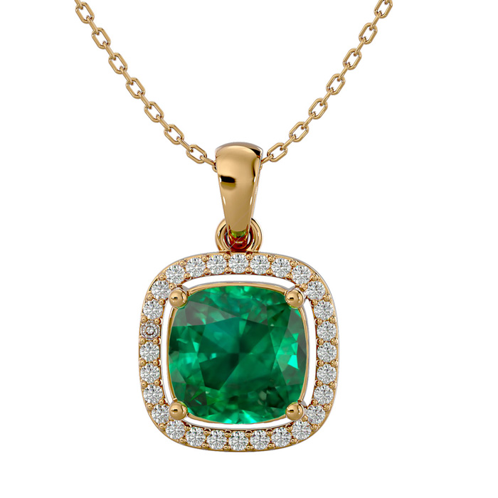 2-1/4 Carat Cushion Shape Emerald Necklaces With Diamond Halo In 14 Karat Yellow Gold, 18 Inch Chain