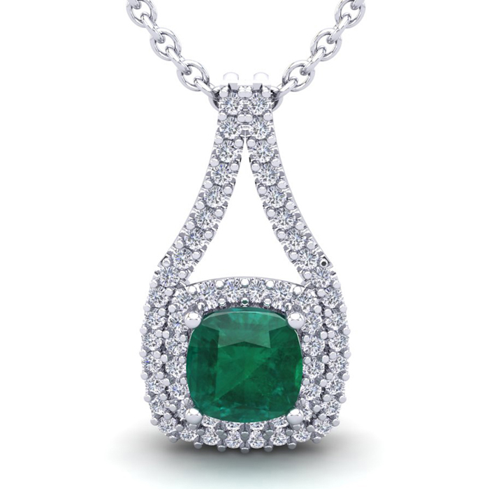 This emerald necklaces features one 8x8mm cushion shape emerald gemstone at approximately 2-1/10 carats. It is surrounded by 58 sparkling diamonds in a halo in I-J color, SI2-I1 clarity at approximately 3/4 carats. Total gem weight is approximately 2-3/4 carats. This necklace is crafted in 14 karat white gold and comes with an 18 inch chain with spring-ring clasp.