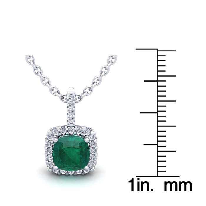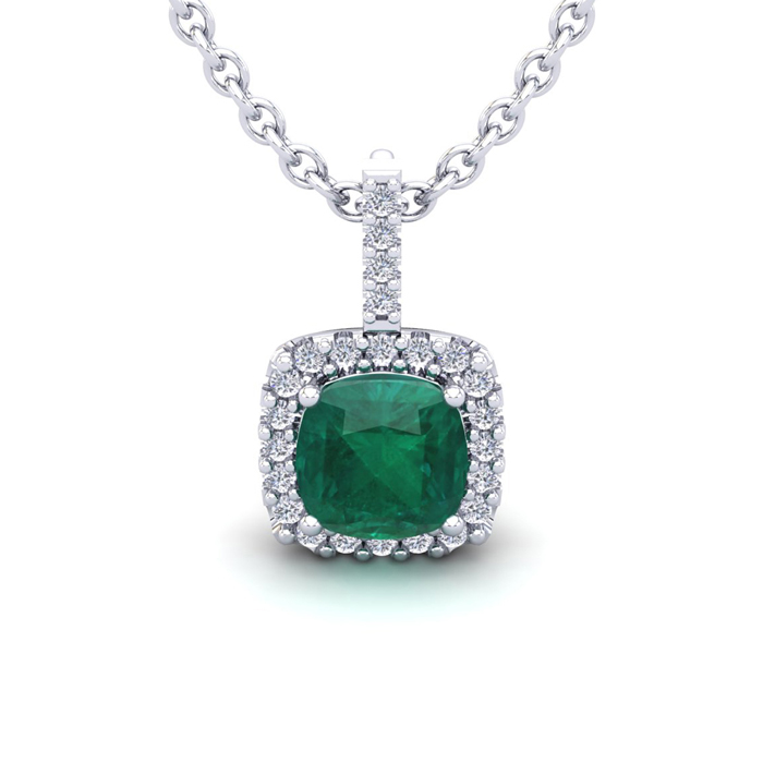 2 Carat Cushion Shape Emerald Necklaces With Diamond Halo In 14 Karat White Gold, 18 Inch Chain