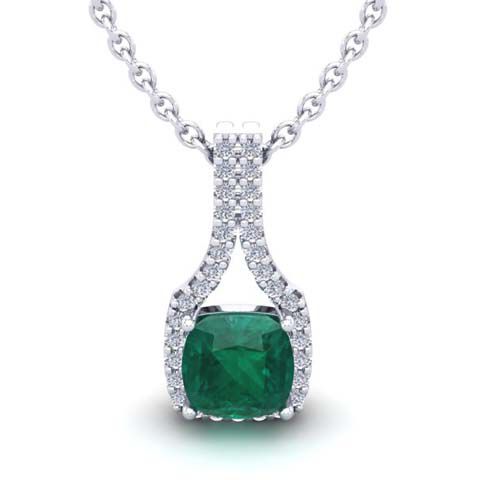 This emerald necklaces features one 7x7mm cushion shape created emerald gemstone at approximately 1-3/5 carats. It is surrounded by 33 sparkling diamonds in a halo in I-J color, SI2-I1 clarity at approximately 1/3 carats. Total gem weight is approximately 2 carats. This necklace is crafted in 14 karat white gold and comes with an 18 inch chain with spring-ring clasp.