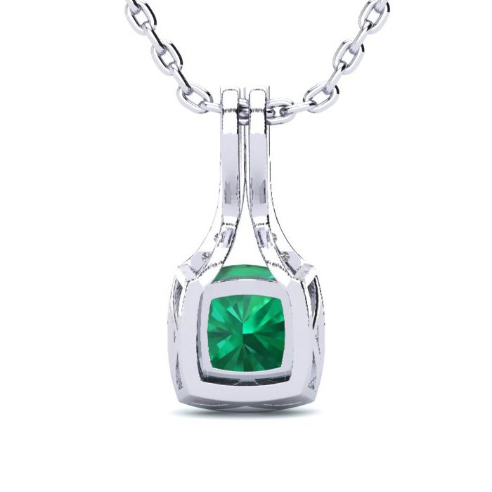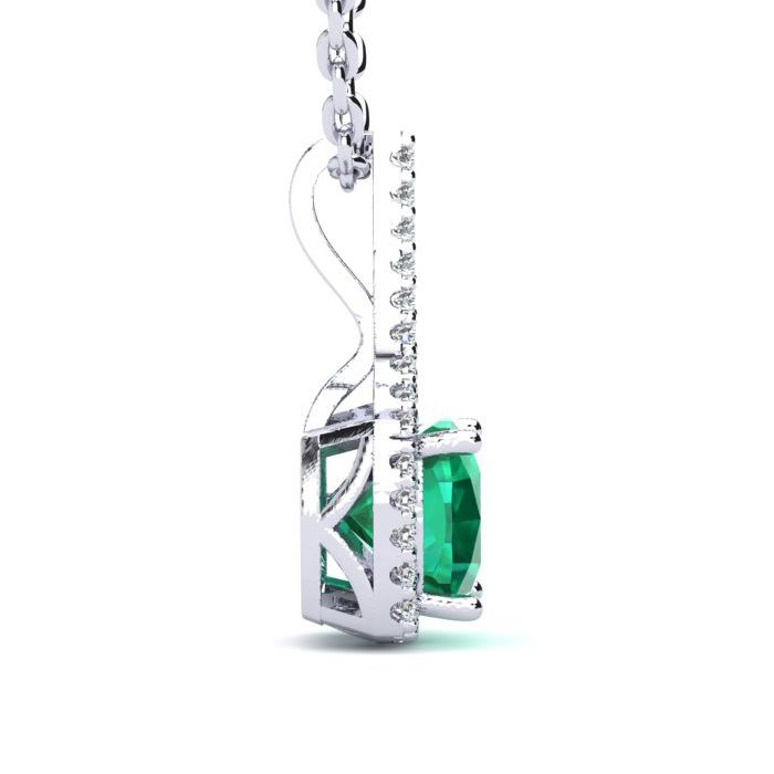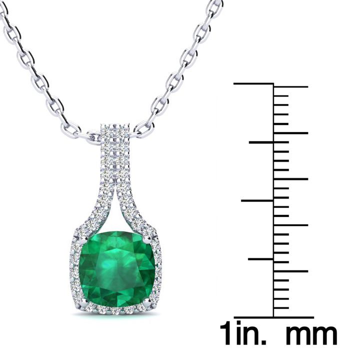 2 Carat Cushion Shape Emerald Necklaces With Diamond Halo In 14 Karat White Gold, 18 Inch Chain