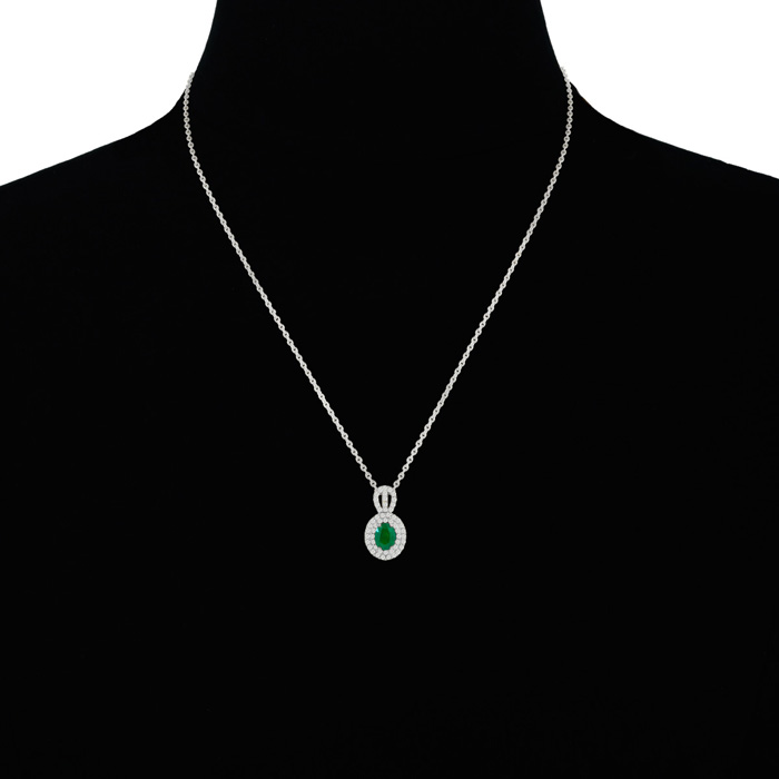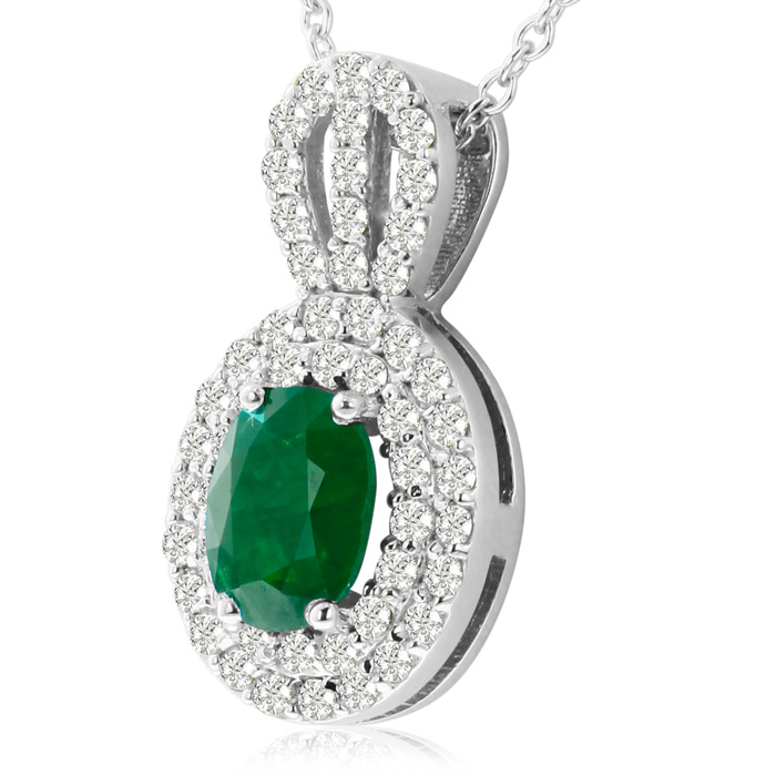 This emerald necklaces features one 9x7mm oval shape emerald gemstone weighing approximately 2-1/2 carats. There are 53 sparkling diamonds in H-I color, SI2 clarity totaling approximately 1 carat. Total carat weight is approximately 3-1/2 carats. This necklace is in 14 karat white gold and comes with an 18 inch chain with spring ring clasp.