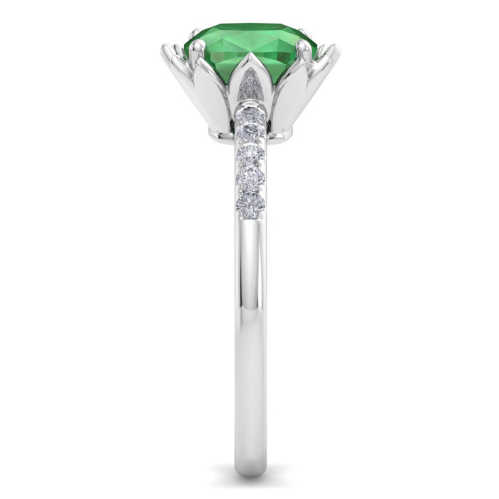 This gemstone ring features one 7mm cushion cut created emerald gemstone weighing approximately 1 1/2 carats. There are 10 sparkling diamonds in I-J color, I1-I2 clarity totaling approximately 0.15 carats. Total carat weight is 1.65 carats. This ring is in 14 karat white gold.