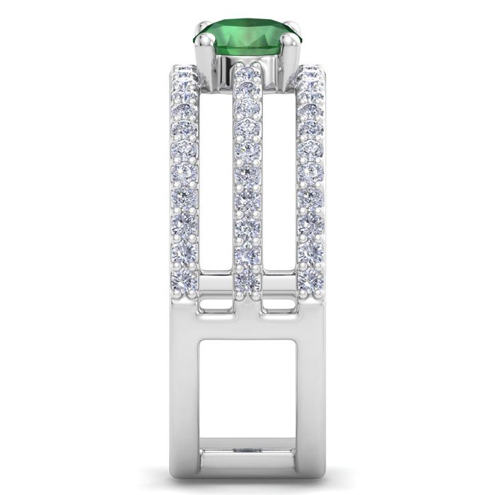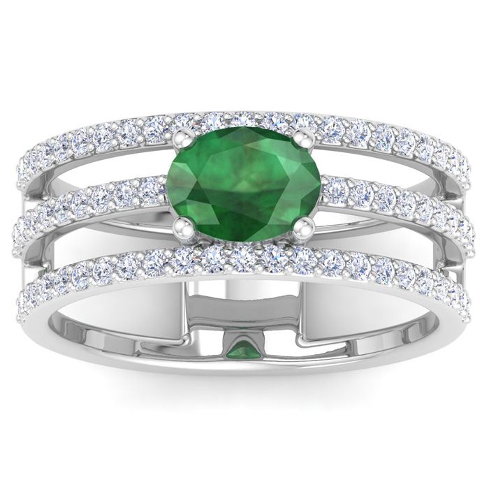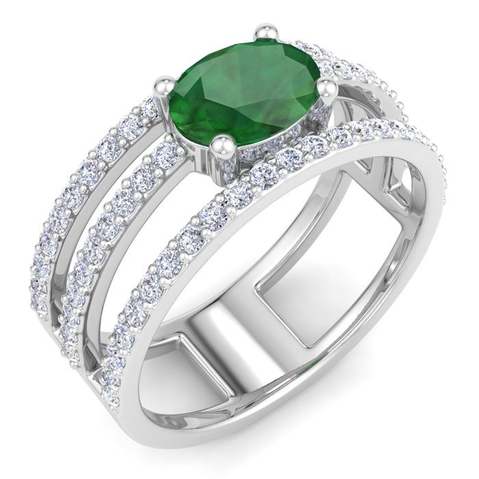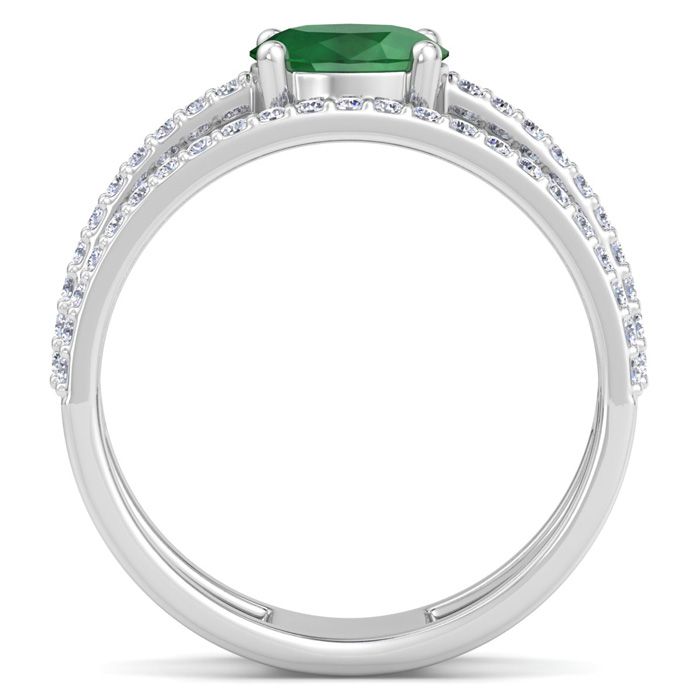 This emerald ring features 66 round shape lab grown diamonds and 1 oval shape center emerald gemstone at approximately 1 1/2 carat total weight. Diamond color is G-H color, VS clarity. Ring is 1/2 inch wide and is in 14 karat white gold.