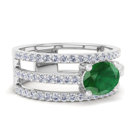 This emerald ring features 66 round shape lab grown diamonds and 1 oval shape center emerald gemstone at approximately 1 1/2 carat total weight. Diamond color is G-H color, VS clarity. Ring is 1/2 inch wide and is in 14 karat white gold.