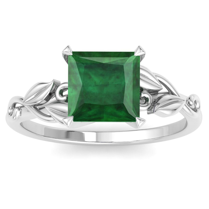 1 1/2 Carat Princess Shape Emerald Ornate Ring In 14K White Gold