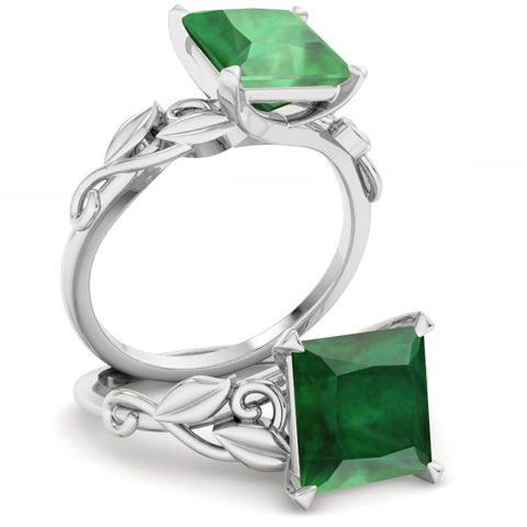 1 1/2 Carat Princess Shape Emerald Ornate Ring In 14K White Gold