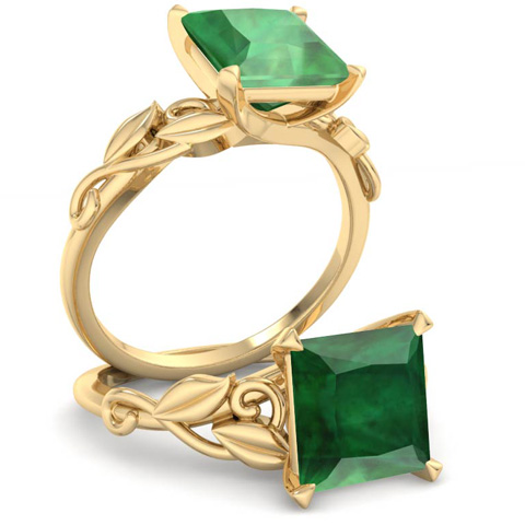 1 1/2 Carat Princess Shape Emerald Ornate Ring In 14K Yellow Gold